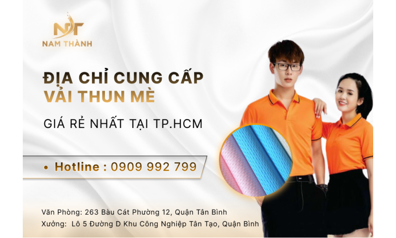 Địa chỉ cung cấp vải thun mè giá rẻ nhất tại TP.HCM (Dệt Nhuộm Nam Thành) là lựa chọn hàng đầu cho nhu cầu của bạn. Hãy đến với chúng tôi để trải nghiệm sự đa dạng về mẫu mã, chất lượng đáng tin cậy và dịch vụ tận tâm. Liên hệ ngay với chúng tôi để được tư vấn và đặt hàng. Chúng tôi cam kết sẽ mang đến cho bạn những trải nghiệm mua sắm tuyệt vời và giá trị vượt trội cho sự thành công trong ngành công nghiệp may mặc của bạn.